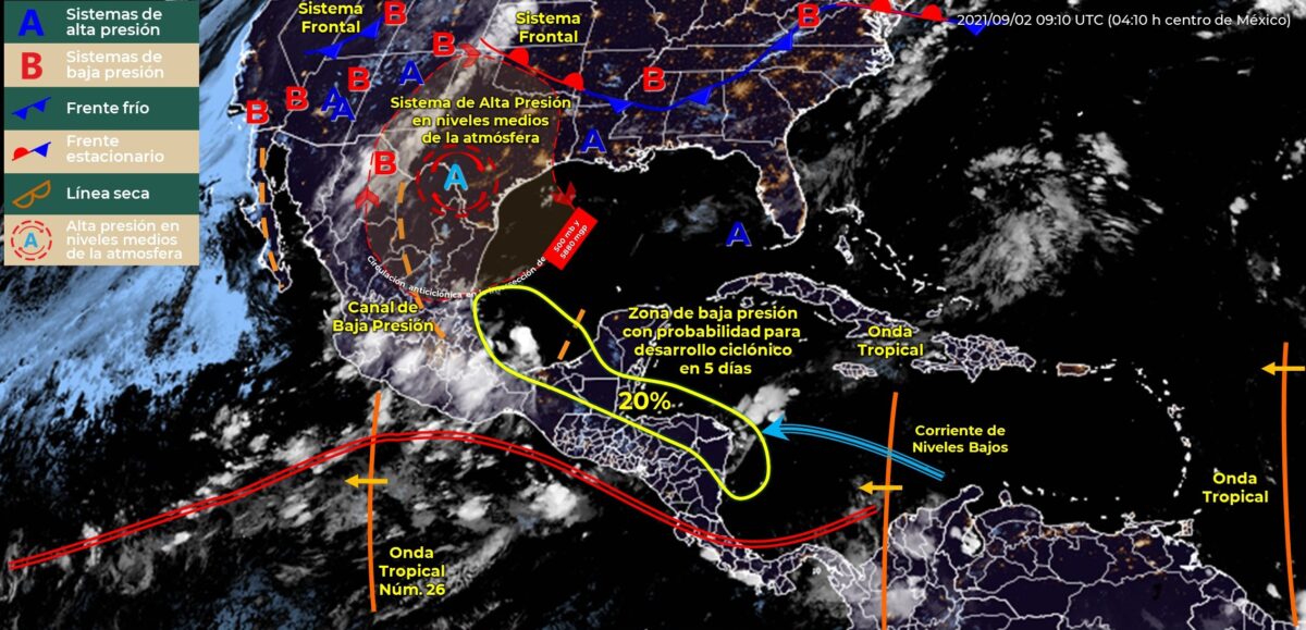 Pronóstico del clima para hoy jueves 2 de septiembre en Quintana Roo. Para hoy, un canal de baja presión se extenderá sobre la Mesa del Norte y la Mesa Central e interaccionará con la onda tropical número 26 que se desplazará por el occidente del territorio nacional y con inestabilidad atmosférica superior, lo que producirá lluvias fuertes a muy fuertes acompañadas de descargas eléctricas y posible caída de granizo en estados del noroeste y centro de México, con lluvias puntuales intensas en Nayarit, Jalisco y Michoacán.