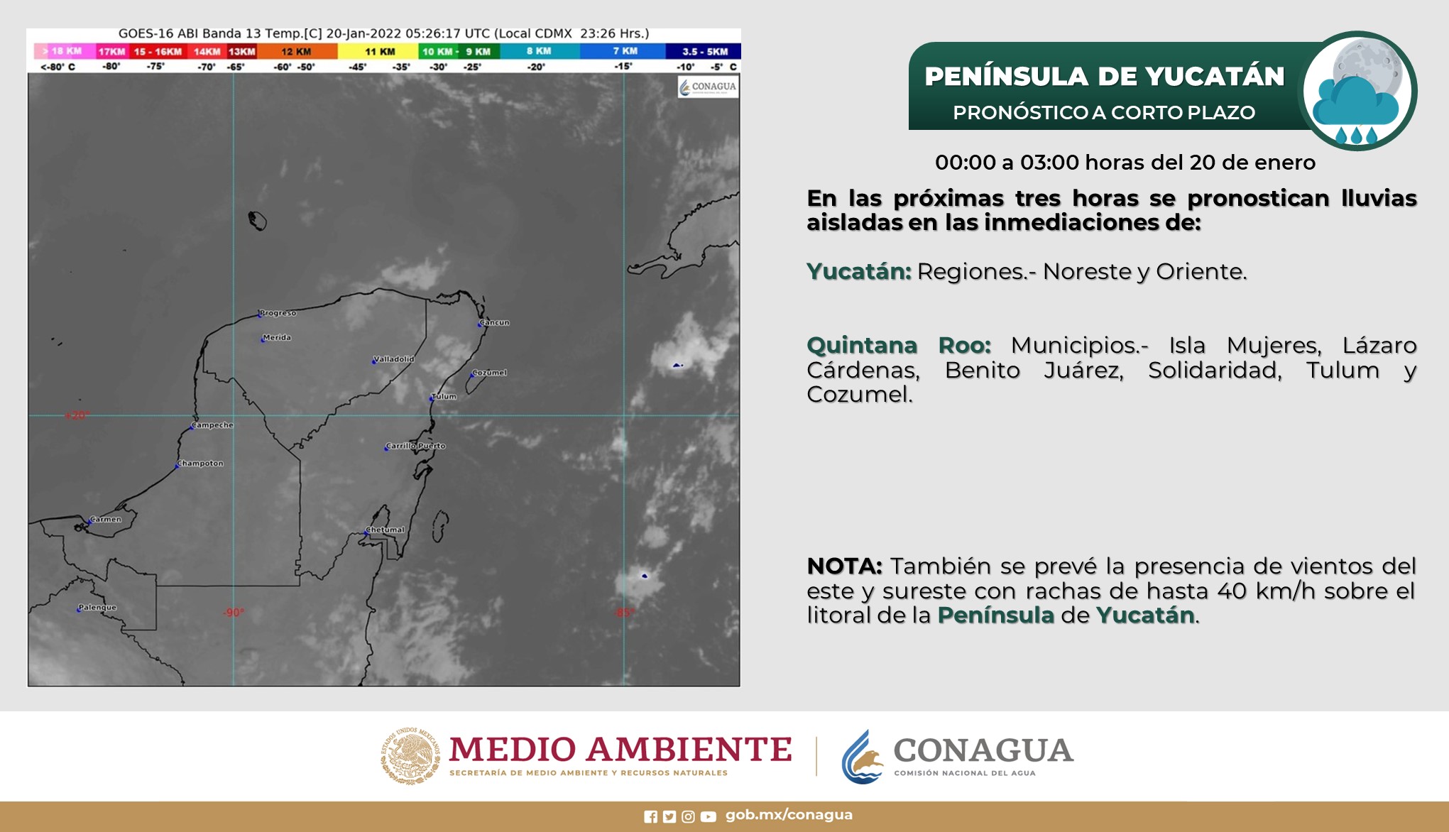 Pronóstico del clima para hoy jueves 20 de enero en Quintana Roo. Para este día, el desplazamiento de la Tercera Tormenta Invernal producirá vientos fuertes a muy fuertes y ambiente matutino muy frío a extremadamente frío sobre el norte y noreste del territorio nacional, lluvias fuertes con posibles descargas eléctricas que pueden generar incremento en los niveles de ríos y arroyos, así como deslaves e inundaciones en zonas bajas de Tamaulipas, Nuevo León y San Luis Potosí.