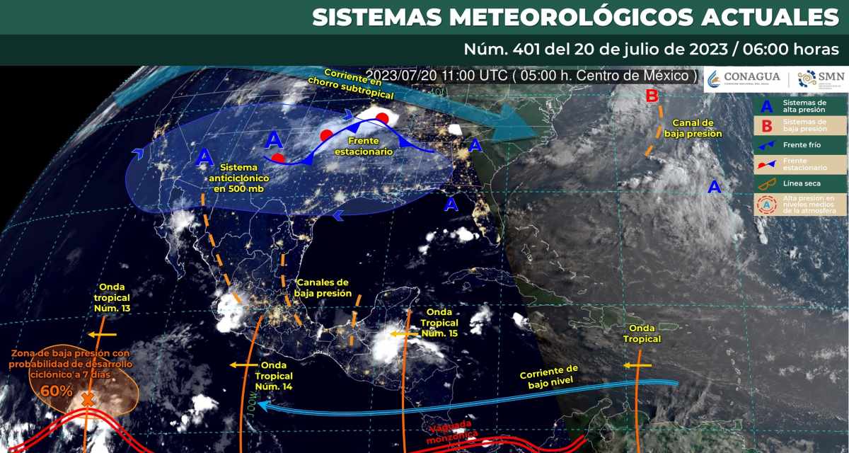 Pronóstico del clima para hoy jueves 20 de julio 2023 en Quintana Roo. Este día, el monzón mexicano continuará propiciando lluvias fuertes a puntuales muy fuertes con descargas eléctricas, rachas de viento y caída de granizo sobre el noroeste de México. La onda tropical número 14 se desplazará sobre el occidente del territorio nacional, aunado a canales de baja presión sobre el interior del país y el ingreso de humedad del Océano Pacífico y Golfo de México, producirán lluvias fuertes a muy fuertes, descargas eléctricas, rachas de viento y posible caída de granizo sobre entidades del occidente y sur de la República Mexicana, además de lluvias y chubascos en el noreste, centro y oriente del país.