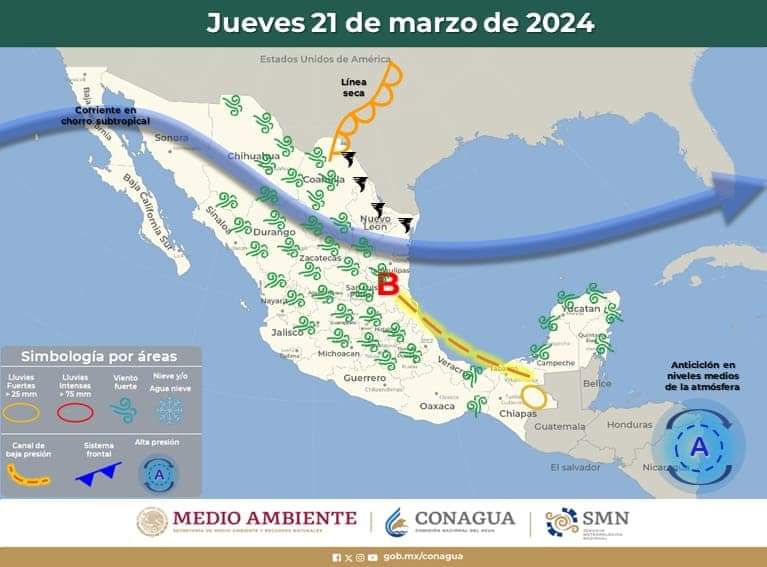 Pronóstico del clima para hoy jueves 21 de marzo de 2024 en Quintana Roo.- Un frente frío se aproximará al noreste del territorio nacional e interaccionará con el aporte de humedad generado por la corriente en chorro subtropical, lo que ocasionará lluvias e intervalos de chubascos con descargas eléctricas, además de rachas de viento fuertes a muy fuertes en el norte y noreste del país, con probable formación de torbellinos en Coahuila, Nuevo León y Tamaulipas.