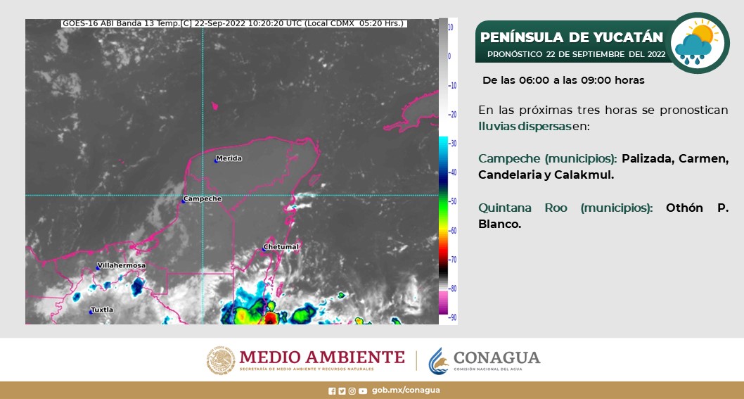 Pronóstico del clima para hoy jueves 22 de septiembre en Quintana Roo. Este día, la tormenta tropical «Newton» se ubicará al sur de las costas de Baja California Sur, reforzará la probabilidad de lluvias muy fuertes en Jalisco y Colima. La vaguada monzónica localizada muy próxima a las costas del Pacífico Sur Mexicano y el ingreso de humedad del Océano Pacífico, generarán lluvias puntuales intensas en Chiapas, lluvias muy fuertes en Michoacán, Guerrero y Oaxaca, lluvias fuertes en Puebla (sur) y chubascos en Morelos.