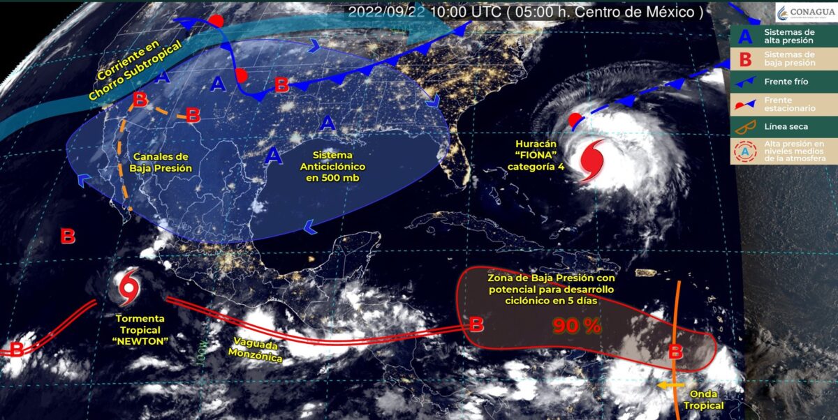 Pronóstico del clima para hoy jueves 22 de septiembre en Quintana Roo. Este día, la tormenta tropical «Newton» se ubicará al sur de las costas de Baja California Sur, reforzará la probabilidad de lluvias muy fuertes en Jalisco y Colima. La vaguada monzónica localizada muy próxima a las costas del Pacífico Sur Mexicano y el ingreso de humedad del Océano Pacífico, generarán lluvias puntuales intensas en Chiapas, lluvias muy fuertes en Michoacán, Guerrero y Oaxaca, lluvias fuertes en Puebla (sur) y chubascos en Morelos.
