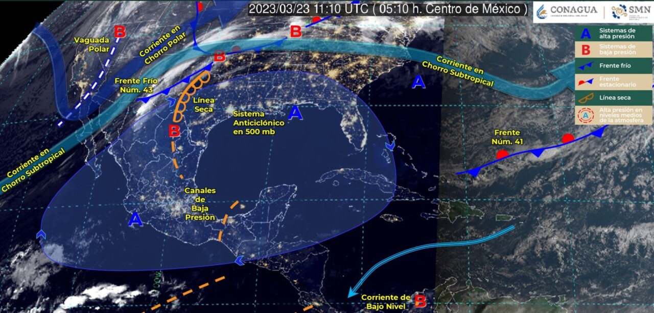 Pronóstico del clima para hoy jueves 23 de marzo 2023 en Quintana Roo. Para este día, la corriente en chorro polar y la vaguada polar, prevalecerán sobre el noroeste de México; mientras que el frente frío número 43, recorrerá el norte de la República Mexicana, e interaccionará con una línea seca sobre el noreste del país. Dichos sistemas generarán chubascos en Baja California, Sonora, Chihuahua y Coahuila.