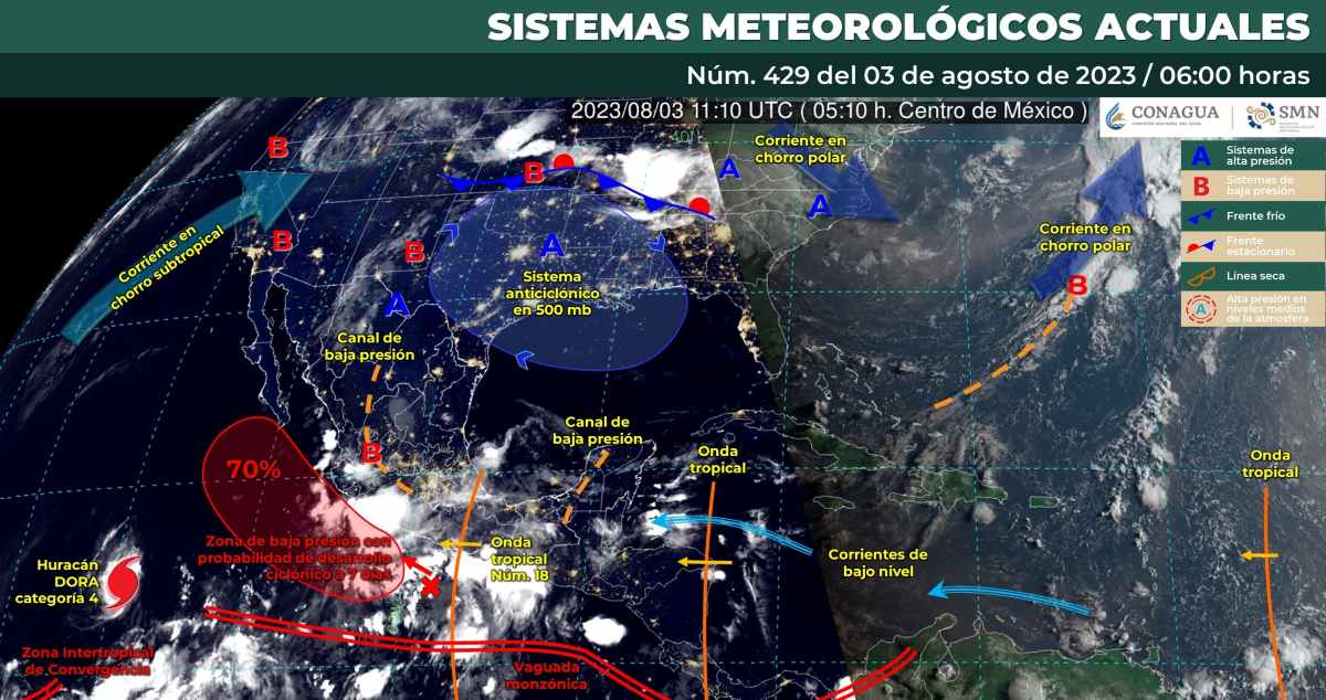 Finalmente, una circulación anticiclónica en niveles medios de la atmósfera mantendrá ambiente cálido a caluroso sobre el noroeste, norte y noreste del territorio nacional, con temperaturas superiores a 45 °C en el norte de Baja California.