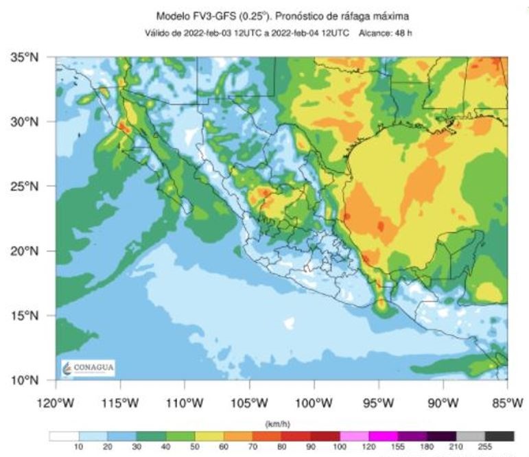 Golfo de México: Cielo nublado la mayor parte del día con chubascos en Tamaulipas. Cielo medio nublado a nublado con probabilidad de lluvias puntuales fuertes que podrían acompañarse de descargas eléctricas en Veracruz. Cielo parcialmente nublado y con probabilidad de lluvias con intervalos de chubascos en Tabasco. Bancos de niebla en zonas serranas de Tamaulipas y Veracruz. Ambiente de frío a fresco durante la mañana y ambiente de templado a cálido por la tarde. Evento de Norte intenso con rachas de 70 a 90 km/h y oleaje de 2 a 4 metros de altura en costas de Tamaulipas y por la tarde en el litoral de Veracruz; así como viento de componente norte con rachas de 50 a 60 km/h en el oeste de Tabasco. Además, probabilidad para la caída de aguanieve en cimas montañosas con altitudes superiores a 4,000 metros sobre el nivel medio del mar del Estado de Veracruz.