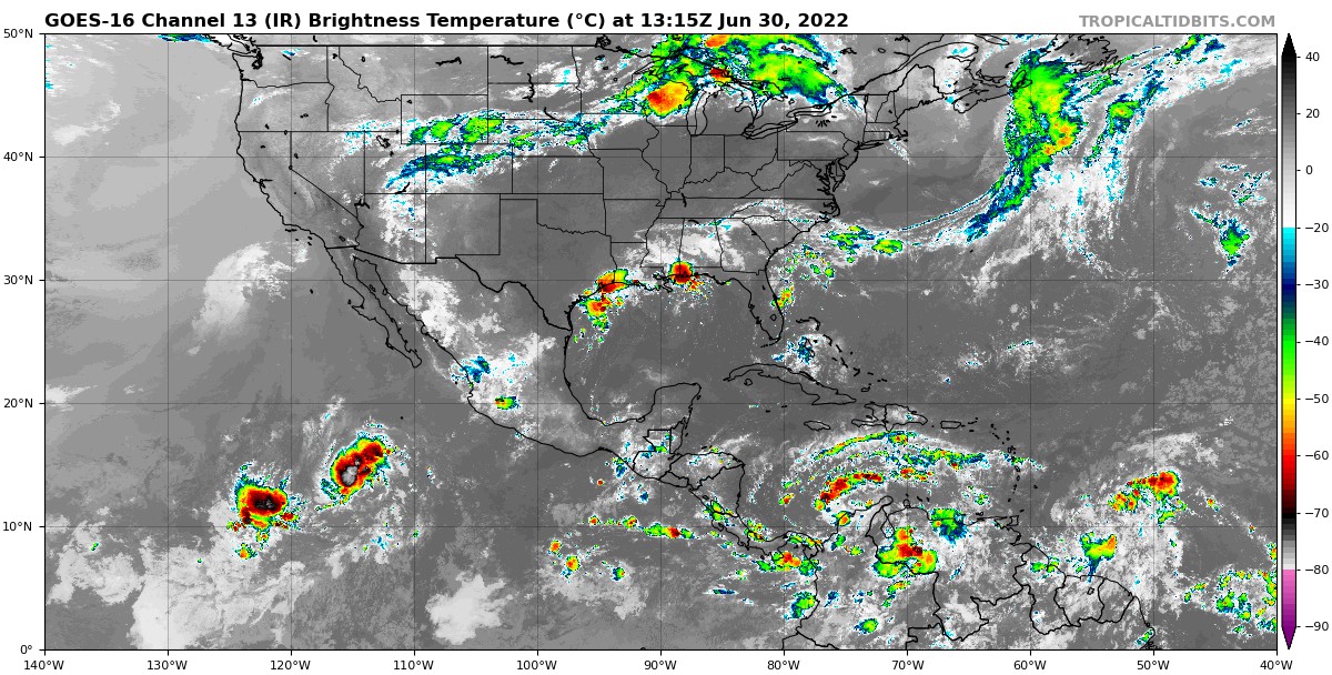 Canal de baja presión sobre el interior del país, asociado con la entrada de humedad de ambos océanos, generarán lluvias puntuales fuertes en zonas del norte y occidente, así como chubascos en el centro y sur de la República Mexicana. Otro canal de baja presión, en el sureste de México, en combinación con la entrada de humedad generada por la nueva onda tropical número 8, sobre el Mar Caribe, ocasionará lluvias puntuales fuertes en el sureste del país, incluida la Península de Yucatán.