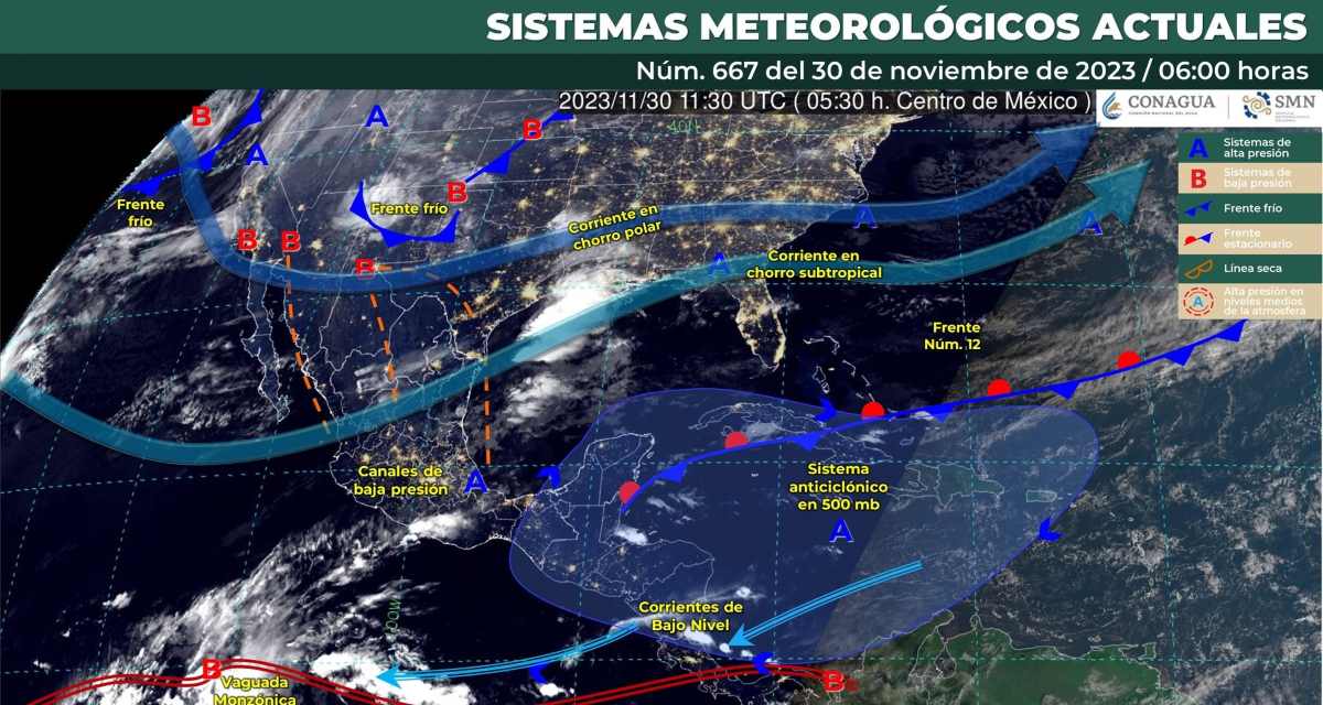 Pronóstico del clima para hoy jueves 30 de noviembre 2023 en Quintana Roo. Para este día, el frente frío 13 que ingresará sobre la región fronteriza de Nuevo León y Coahuila extendiéndose hasta el oriente de Chihuahua, y el frente frío (14) que ingresará esta tarde sobre el norte de Baja California y el noroeste de Sonora, interaccionarán con un canal de baja presión en altura y con la corriente en chorro subtropical, lo que originará descenso de la temperatura y rachas de viento con posibles tolvaneras en la región fronteriza del norte y noroeste de México.