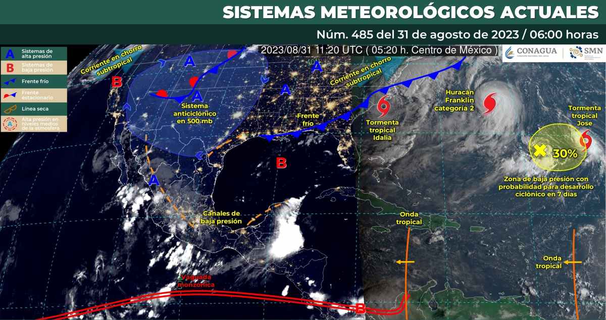 Pronóstico del clima para hoy jueves 31 de agosto 2023 en Quintana Roo. Este día, el monzón mexicano en interacción con inestabilidad en niveles altos de la atmósfera, propiciará chubascos y lluvias fuertes con descargas eléctricas y rachas de viento.