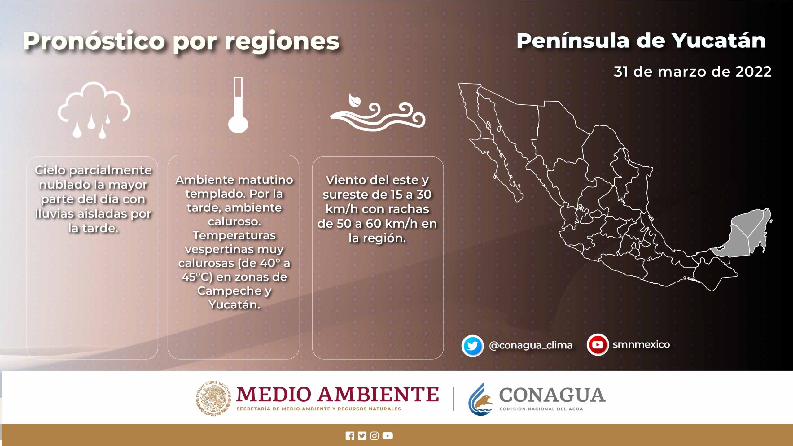 Península de Yucatán: Cielo parcialmente nublado la mayor parte del día con lluvias aisladas por la tarde. Ambiente matutino templado. Por la tarde, ambiente caluroso. Temperaturas vespertinas muy calurosas (de 40° a 45°C) en zonas de Campeche y Yucatán. Viento del este y sureste de 15 a 30 km/h con rachas de 50 a 60 km/h en la región.