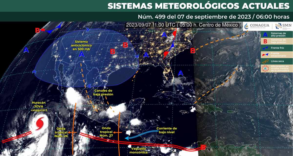A su vez, la onda tropical número 26 se desplazará al suroeste de las costas de Colima y Jalisco, aunada al ingreso de humedad del Océano Pacífico, ocasionarán lluvias puntuales fuertes a muy fuertes en el occidente del país.