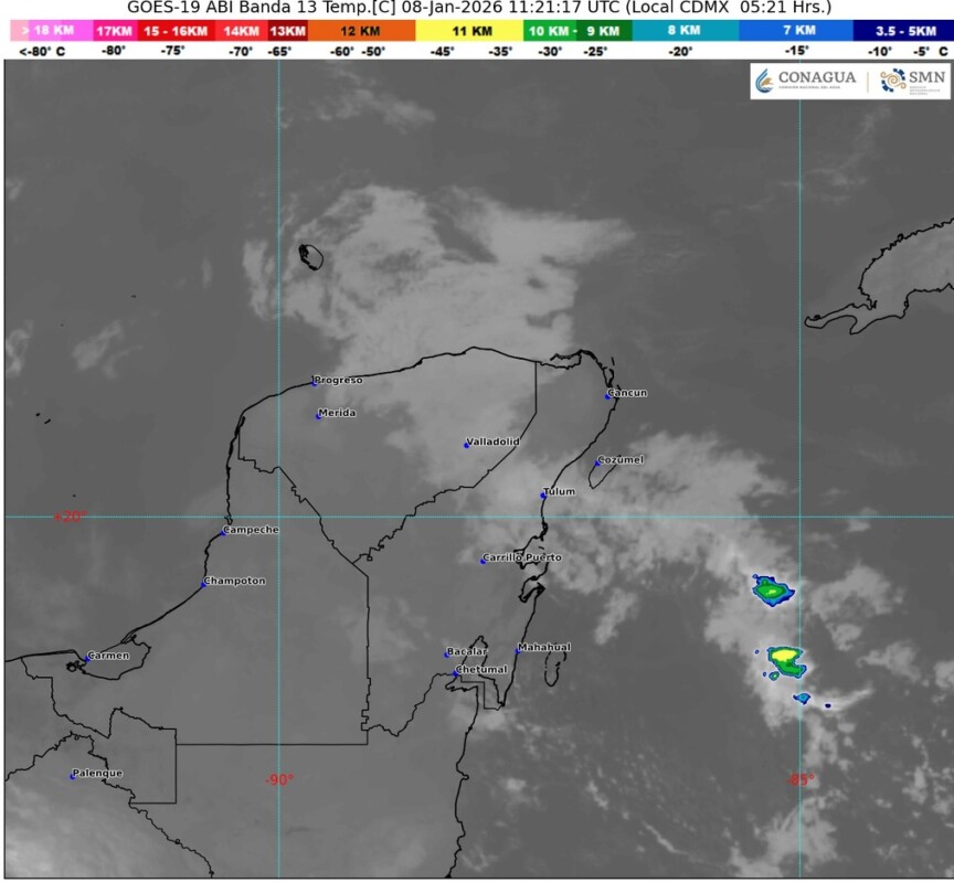Pronóstico del clima para hoy jueves 8 de enero 2026 en Quintana Roo; cielo medio nublado a nublado con probabilidad de chubascos en el estado.