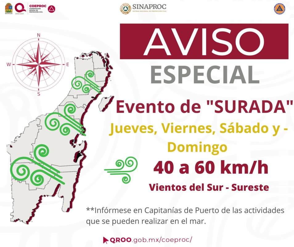 De igual manera, se mantendrá el viento de componente sur (surada) con rachas fuertes en el litoral del Golfo de México, el sureste mexicano y la Península de Yucatán.