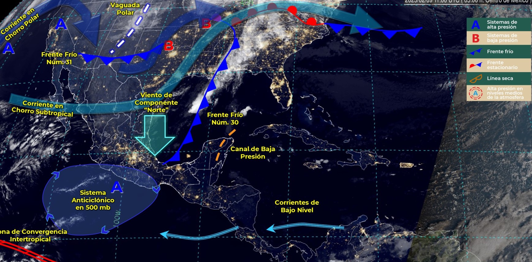 A partir del mediodía, el nuevo frente frío número 31 ingresará sobre el norte de México, e interaccionará con una vaguada polar ubicada al norte de Chihuahua y Coahuila y con las corrientes en chorro polar y subtropical, originando marcado descenso de la temperatura.