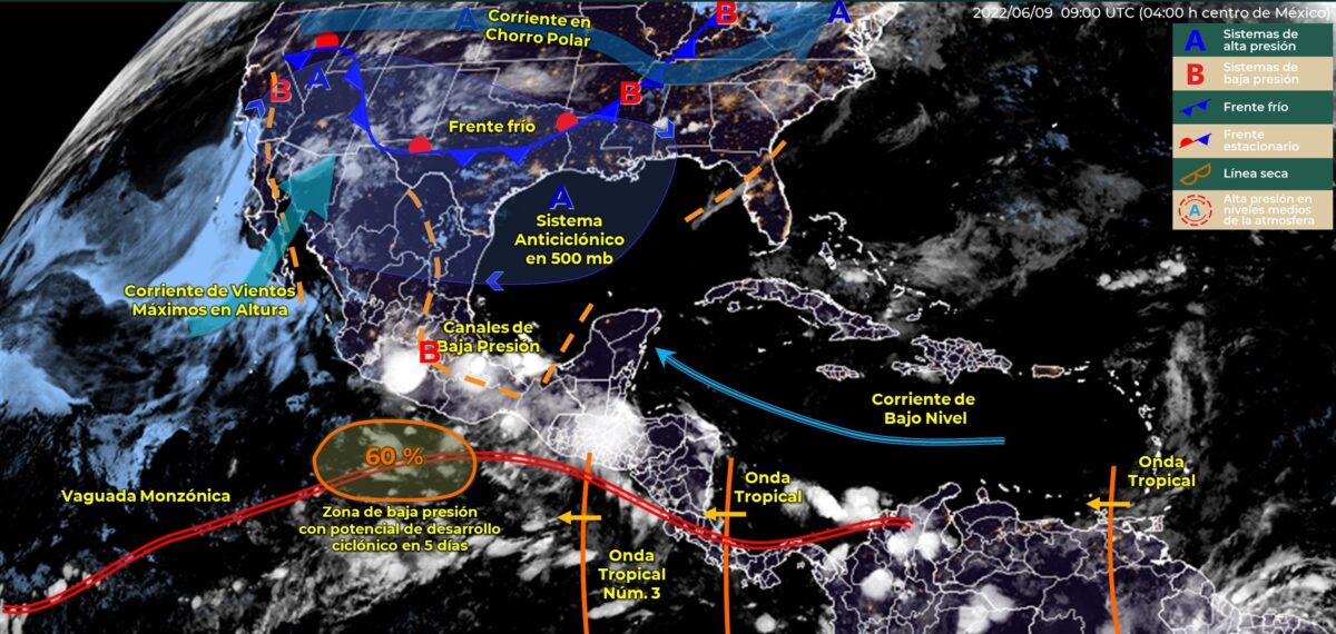 Pronóstico del clima para hoy jueves 9 de junio en Quintana Roo. Para este día, la onda tropical número 3 recorrerá el sureste de México en interacción con la vaguada monzónica sobre el Golfo de Tehuantepec, lo que mantendrá un temporal de lluvias con acumulados puntuales intensos en Oaxaca y Chiapas, que podrían generar el incremento en los niveles de ríos y arroyos, deslaves e inundaciones en el sur y sureste del país.