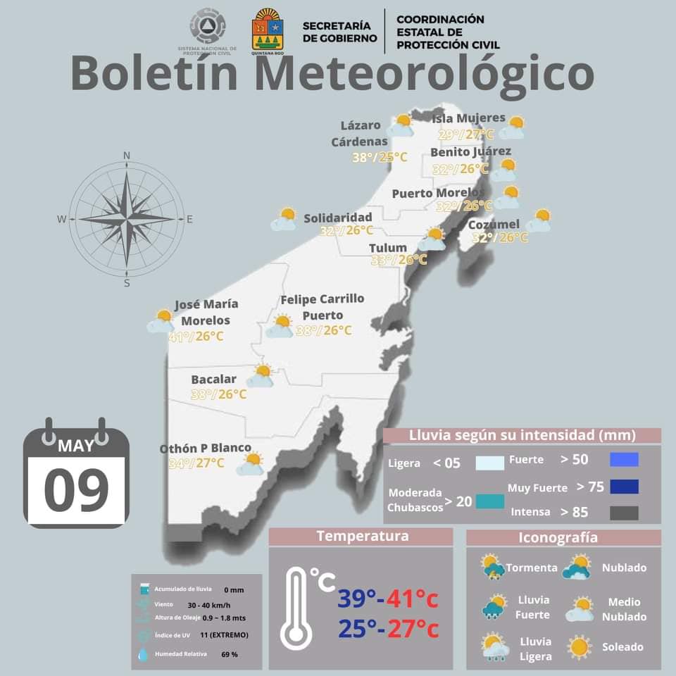 Pronóstico del clima para hoy jueves 9 de mayo 2024 en Quintana Roo. La circulación anticiclónica en niveles medios de la atmósfera mantendrá la segunda onda de calor de la temporada en gran parte de la República Mexicana, incluido el Valle de México, con temperaturas superiores a 45 °C en zonas de Nuevo León, Tamaulipas, San Luis Potosí, Hidalgo (norte), Michoacán, Guerrero, Oaxaca, Chiapas, Veracruz, Tabasco, Campeche y Yucatán.