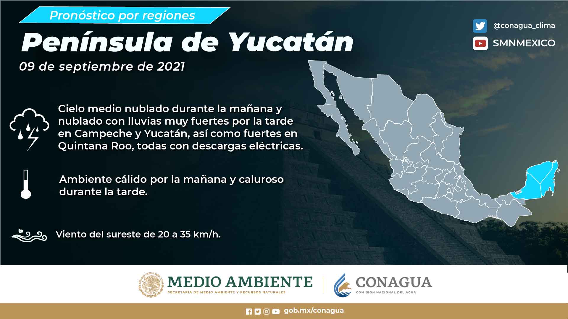 Península de Yucatán: Cielo medio nublado durante la mañana y nublado con lluvias muy fuertes por la tarde en Campeche y Yucatán, así como fuertes en Quintana Roo, todas con descargas eléctricas. Ambiente cálido por la mañana y caluroso durante la tarde. Viento del sureste de 20 a 35 km/h.