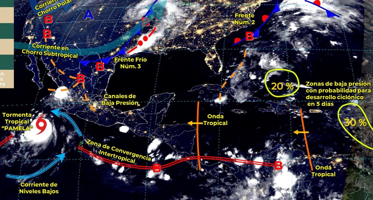 Pronóstico del clima para hoy lunes 11 de octubre en Quintana Roo. Este día, la tormenta tropical “Pamela” se localizará al suroeste de las costas de Colima y Jalisco, pudiendo intensificarse a Huracán durante la tarde-noche.