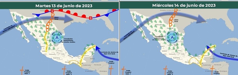 Pronóstico del clima para hoy lunes 12 de junio 2023 en Quintana Roo. Este día, una línea seca sobre el norte de México, la corriente en chorro subtropical, dos canales de baja presión, uno extendido sobre el norte y centro del país, y otro sobre el sureste y la Península de Yucatán, en interacción con inestabilidad en niveles altos de la atmósfera, con el ingreso de humedad del Océano Pacífico, Golfo de México y Mar Caribe, y con el desplazamiento de la onda tropical 2 al sur de las costas de Guerrero, ocasionarán lluvias puntuales fuertes en Oaxaca, Chiapas, Campeche, Yucatán y Quintana Roo.