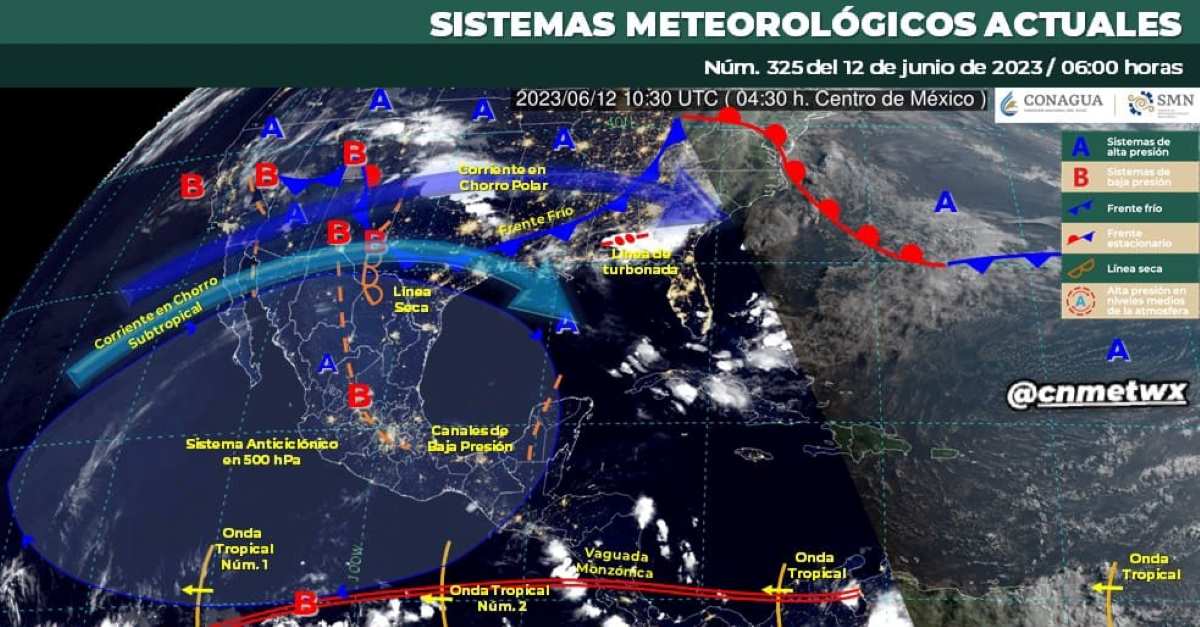 Pronóstico del clima para hoy lunes 12 de junio 2023 en Quintana Roo. Este día, una línea seca sobre el norte de México, la corriente en chorro subtropical, dos canales de baja presión, uno extendido sobre el norte y centro del país, y otro sobre el sureste y la Península de Yucatán, en interacción con inestabilidad en niveles altos de la atmósfera, con el ingreso de humedad del Océano Pacífico, Golfo de México y Mar Caribe, y con el desplazamiento de la onda tropical 2 al sur de las costas de Guerrero, ocasionarán lluvias puntuales fuertes en Oaxaca, Chiapas, Campeche, Yucatán y Quintana Roo.