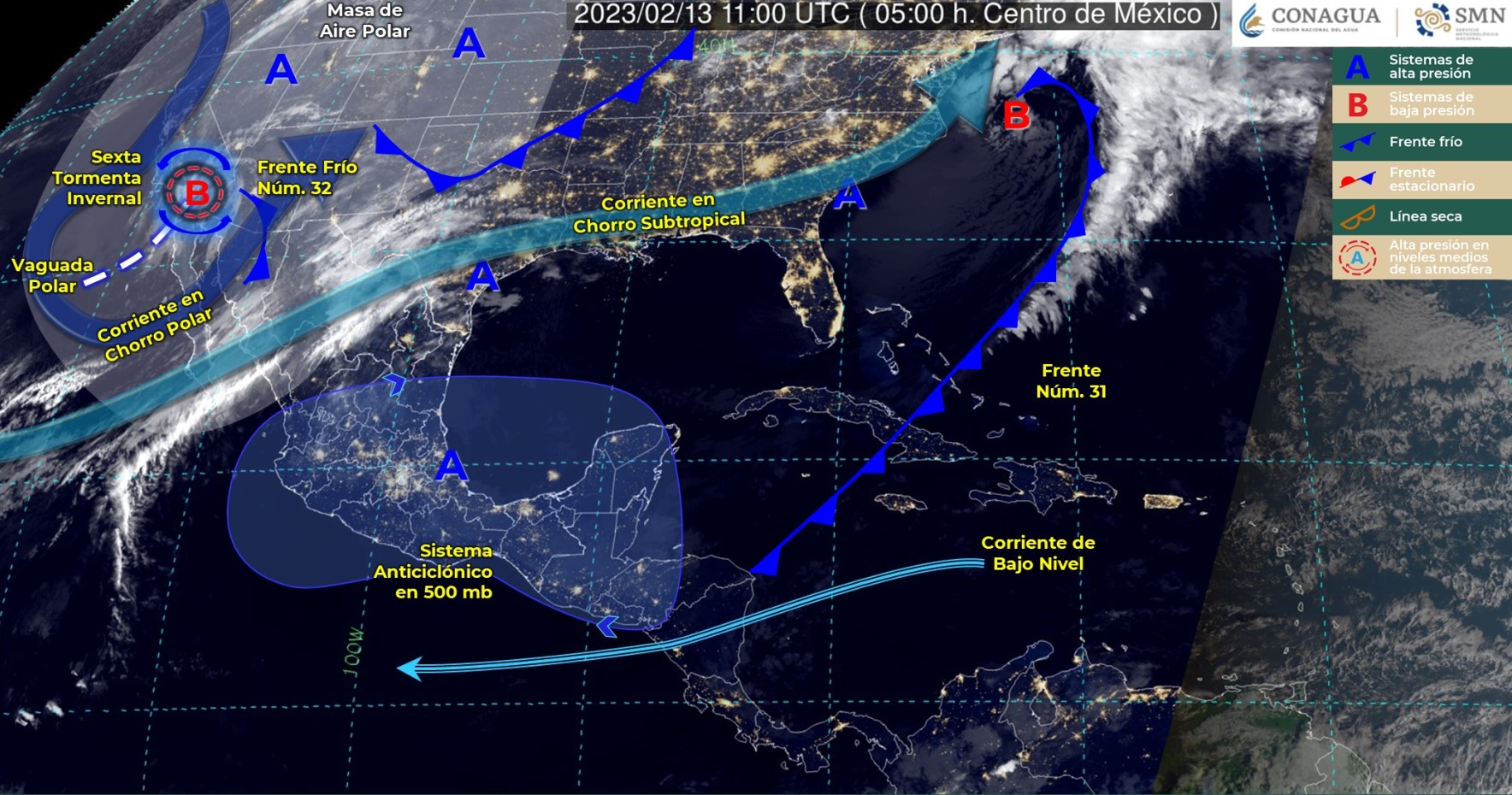 Asimismo, se mantendrá el ambiente de frío a gélido en el noroeste y norte de México. Se prevé que al final del día la sexta tormenta invernal se mueva hacia el norte, internándose en los Estados Unidos y dejando de afectar al país.