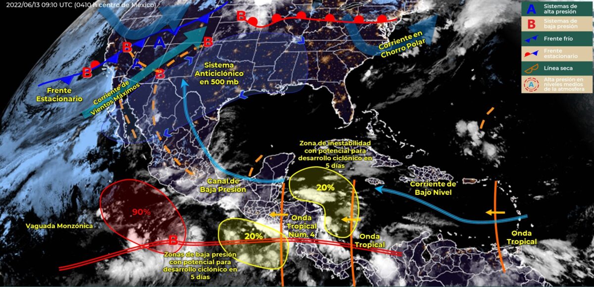El avance de la onda tropical número 4 sobre el sur de la Península de Yucatán y el Golfo de Tehuantepec, generará lluvias puntuales intensas en Chiapas, muy fuertes en Tabasco, así como chubascos y lluvias puntuales fuertes en la Península de Yucatán.