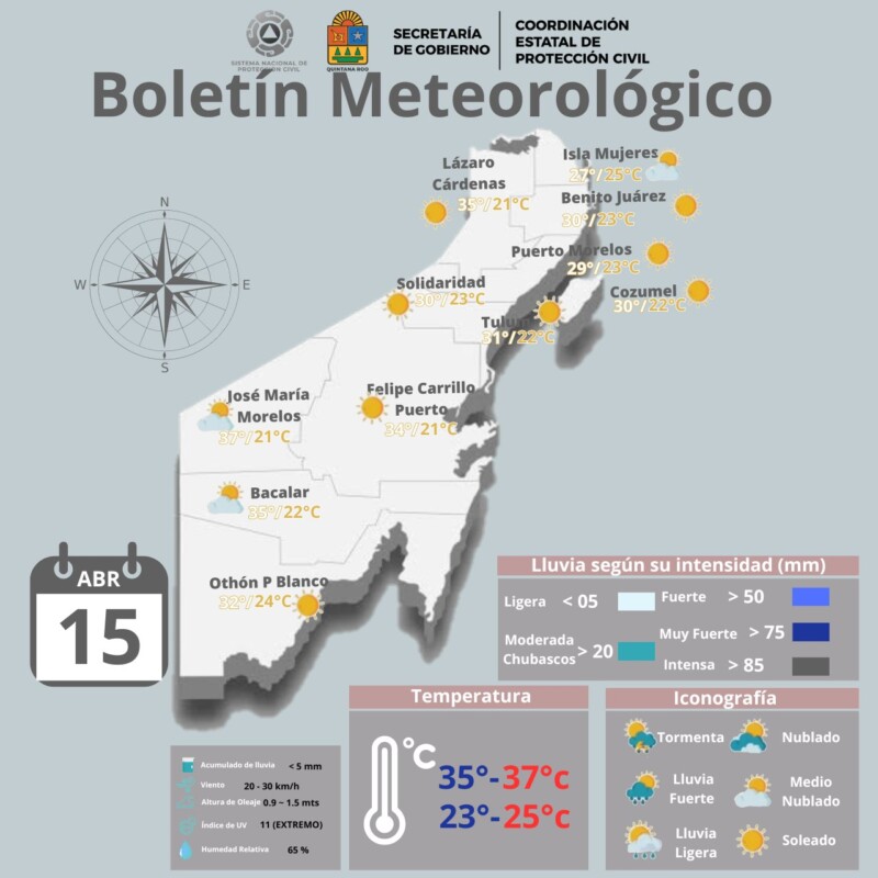 Pronóstico del clima para hoy lunes 15 de abril de 2024 en Quintana Roo. Este día, persistirá una circulación anticiclónica en niveles medios de la atmósfera manteniendo la onda de calor, con ambiente caluroso a muy caluroso sobre la mayor parte del territorio nacional, incluido el Valle de México y la Península de Yucatán, con temperaturas máximas que podrían superar los 45 °C en Sinaloa, Michoacán, Guerrero, Oaxaca, Chiapas, Veracruz, Tabasco y Campeche.