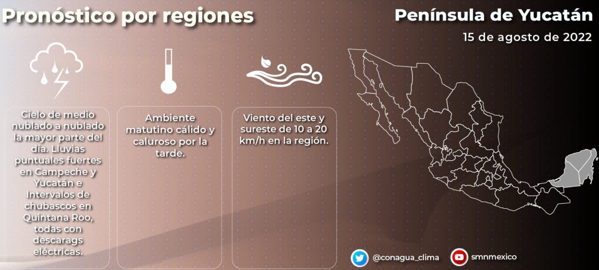 Península de Yucatán: Cielo medio nublado a nublado la mayor parte del día. Ambiente matutino cálido y caluroso por la tarde. Lluvias puntuales fuertes en Campeche y Yucatán e Intervalos de chubascos en Quintana Roo, todas con descargas eléctricas. Viento del este y sureste de 10 a 20 km/h en la región.
