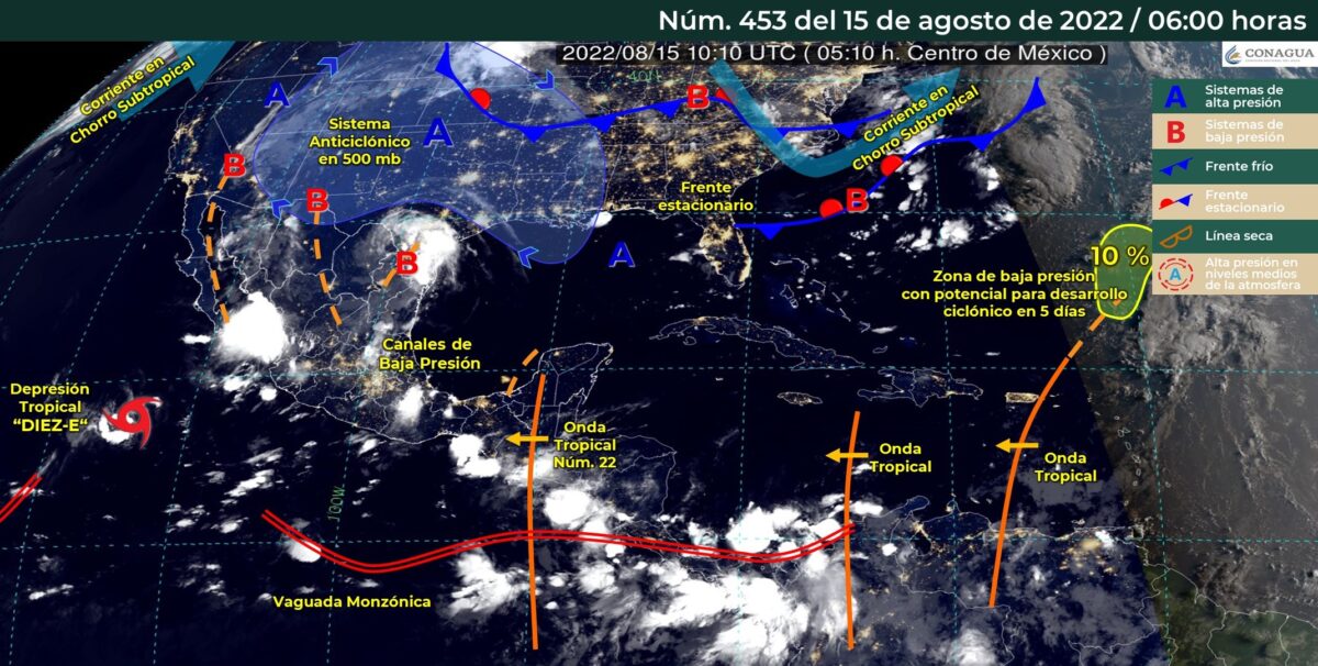 Golfo de México: Cielo medio nublado a nublado con lluvias puntuales intensas en Tamaulipas, puntuales muy fuertes en Veracruz y chubascos en Tabasco; todas con descargas eléctricas. Dichas lluvias podrían generar deslaves e inundaciones. Ambiente fresco a templado por la mañana, así como frío en zonas montañosas de Veracruz. Por la tarde, ambiente caluroso. Viento del este y sureste de 15 a 30 km/h en la región con rachas de 50 a 60 km/h en Tamaulipas.