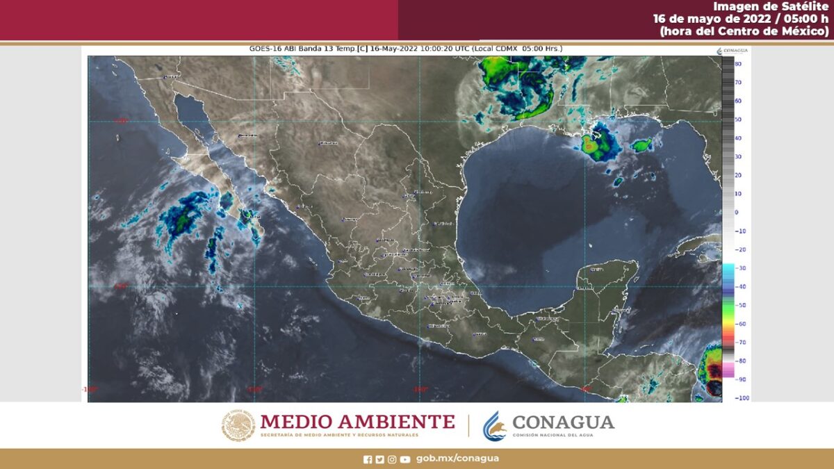 Por la tarde, canales de baja presión sobre el interior del país, en interacción con la entrada de humedad proveniente de ambos océanos, producirán chubascos acompañados de descargas eléctricas y posible caída de granizo sobre el norte, occidente, sur y sureste de México, así como en el oriente y occidente de la Península de Yucatán, con lluvias puntuales fuertes en el sur de Chiapas.