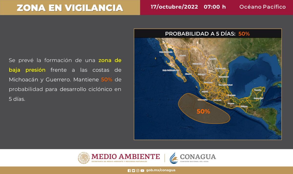 Pacífico Sur: Cielo despejado a medio nublado por la mañana, aumento de nublados por la tarde con probabilidad de lluvias puntuales intensas en Oaxaca, así como lluvias puntuales muy fuertes en Guerrero y Chiapas, todas acompañadas de descargas eléctricas. Dichas lluvias podrían originar incremento en los niveles de ríos y arroyos, y ocasionar deslaves e inundaciones en zonas bajas. Ambiente matutino templado, siendo fresco a frío y con bancos de niebla al amanecer en zonas serranas. Ambiente cálido por la tarde. Viento de dirección variable de 10 a 25 km/h en la región, rachas de hasta 45 km/h en el Istmo de Tehuantepec.