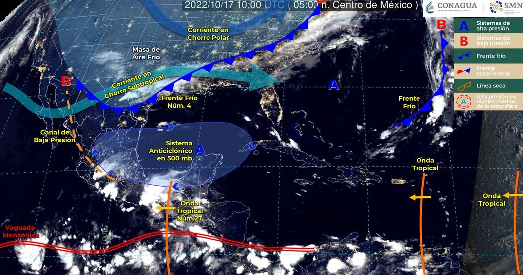 Por otro lado, la onda tropical número 27 se desplazará sobre el sureste mexicano, gradualmente sobre el oriente y sur del territorio nacional, en combinación con el ingreso de humedad del Golfo de México y Mar Caribe generará chubascos y lluvias fuertes en las regiones mencionadas, además de la Península de Yucatán, con lluvias puntuales intensas en Oaxaca y Veracruz; muy fuertes en Guerrero y Chiapas. Finalmente, una circulación anticiclónica en niveles medios de la atmósfera ocasionará temperaturas vespertinas cálidas a calurosas sobre la Península de Yucatán.