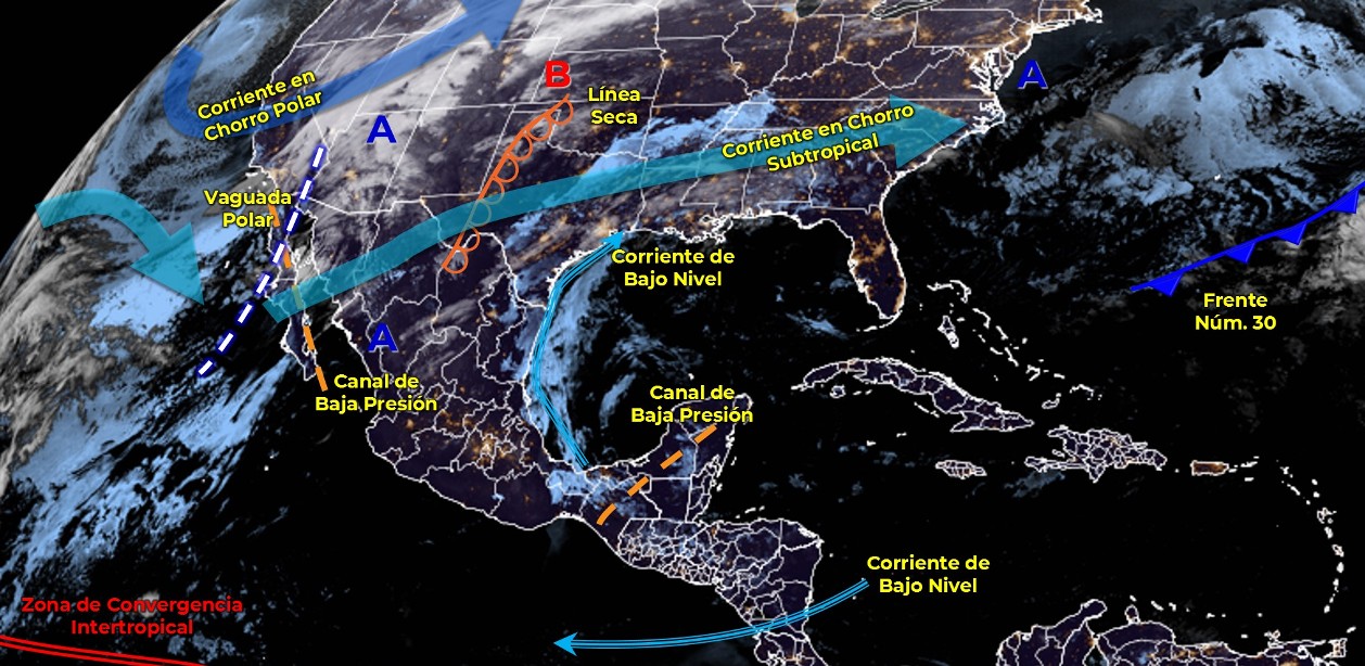 La entrada de humedad del océano Pacífico y mar Caribe en interacción con un canal de baja presión en el sureste del país, propiciarán chubascos dispersos en Chiapas y Quintana Roo y lluvias aisladas en el occidente, centro, sur y sureste mexicano, además del resto de la Península de Yucatán, con posibles descargas eléctricas en Hidalgo, Estado de México, Michoacán y Guerrero.