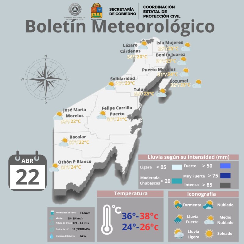 Pronóstico del clima para hoy lunes 22 de abril de 2024 en Quintana Roo; cielo medio nublado a nublado con lluvias aisladas en el estado y Yucatán.