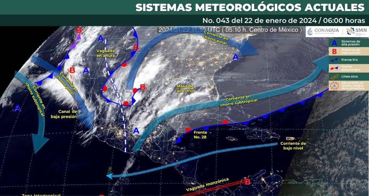 Pronóstico del clima para hoy lunes 22 de enero de 2024 en Quintana Roo. Para este día, un frente frío (No. 29) de corta duración, se aproximará al noroeste del territorio nacional, interaccionará con inestabilidad en niveles altos de la atmósfera y con las corrientes en chorro polar y subtropical, ocasionando lluvias puntuales intensas en Baja California.