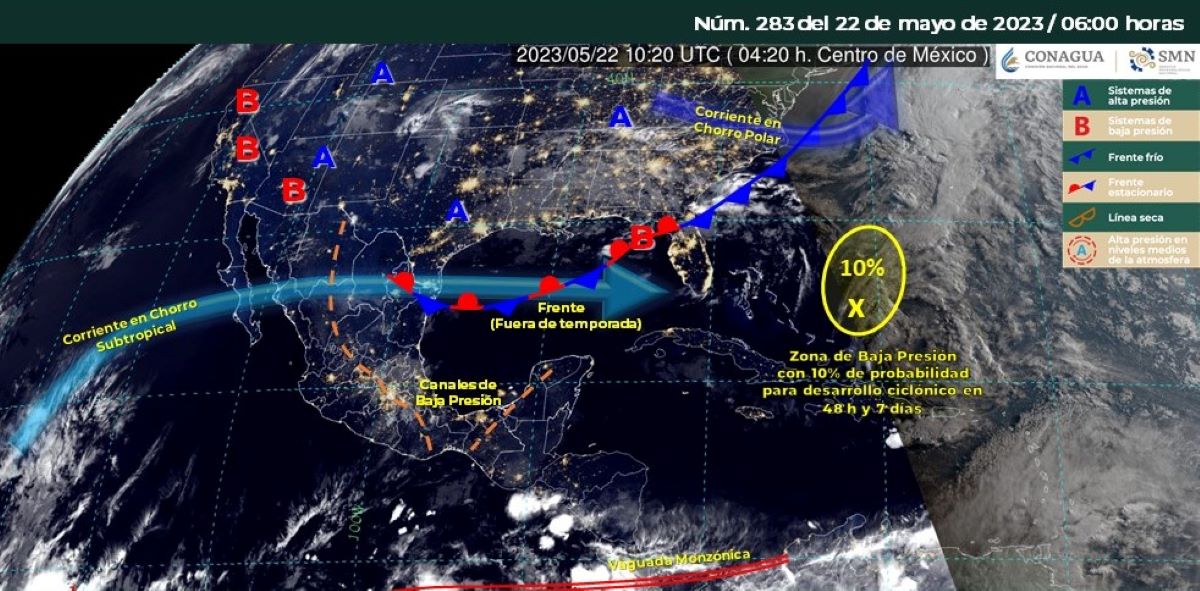 Finalmente, continuará el ambiente caluroso a muy caluroso en el litoral del Pacífico Mexicano, el sureste de la República Mexicana y la Península de Yucatán, con temperaturas máximas superiores a 40 °C en zonas de Sinaloa, Nayarit, Jalisco, Colima, Michoacán, Guerrero, incluida la Península de Yucatán.