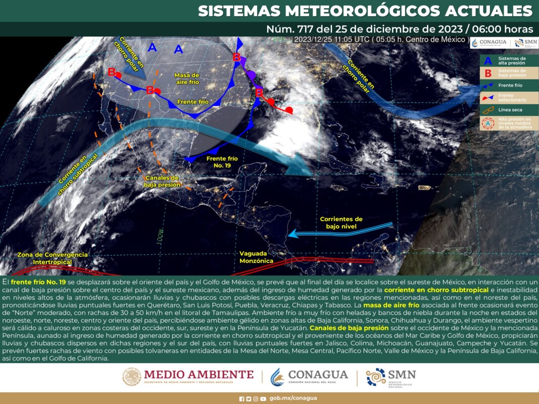 Pronóstico del clima para hoy lunes 25 de diciembre 2023 en Quintana Roo. Este día, el frente frío número 19 se desplazará sobre el oriente del país y el Golfo de México, se prevé que al final del día se localice sobre el sureste de México, en interacción con un canal de baja presión sobre el centro del país y el sureste mexicano, además del ingreso de humedad generado por la corriente en chorro subtropical e inestabilidad en niveles altos de la atmósfera, ocasionarán lluvias y chubascos con posibles descargas eléctricas en las regiones mencionadas, así como en el noreste del país, pronosticándose lluvias puntuales fuertes en Querétaro, San Luis Potosí, Puebla, Veracruz, Chiapas y Tabasco.