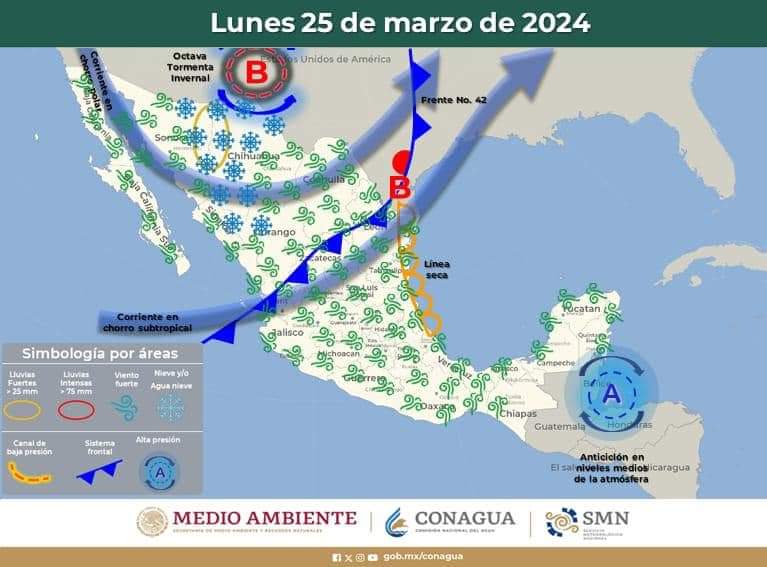 Pronóstico del clima para hoy lunes 25 de marzo de 2024 en Quintana Roo. Este día, la octava tormenta invernal se ubicará al norte de México, se asociará con una vaguada polar sobre el noroeste y norte del país, así como con las corrientes en chorro polar y subtropical, en interacción con el frente frío No. 42 que recorrerá el noreste del territorio nacional, ocasionarán marcado descenso en las temperaturas diurnas, lluvias puntuales fuertes en Sonora y Chihuahua.