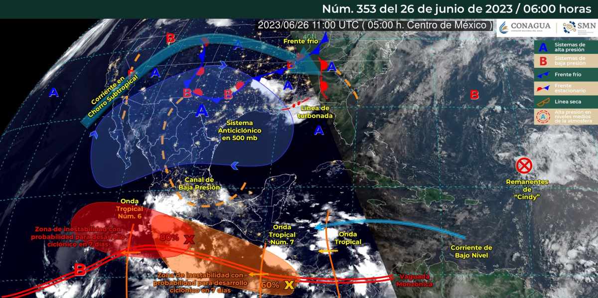 También se prevén chubascos en el centro y oriente del territorio nacional; por otra parte, una circulación anticiclónica en niveles medios de la atmósfera se desplazará hacia el sur de Estados Unidos; sin embargo, aún mantendrá el ambiente muy caluroso a extremadamente caluroso sobre los estados del noroeste, norte y noreste de la República Mexicana.