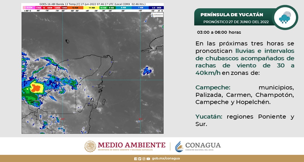 Península de Yucatán: Cielo medio nublado por la mañana, incrementando la nubosidad en el transcurso del día con probabilidad de lluvias e intervalos de chubascos en Campeche, Yucatán y Quintana Roo; todas con descargas eléctricas. Ambiente templado por la mañana y caluroso por la tarde. Viento del norte y noreste de 10 a 25 km/h en la región, con rachas de 30 a 40 km/h en Campeche y Yucatán.