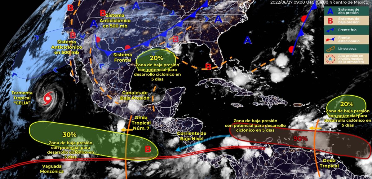 Pronóstico del clima para hoy lunes 27 de junio en Quintana Roo. Para este día, una zona de baja presión con potencial ciclónico situada al sur de las costas de Chiapas y la onda tropical número 7, ubicada al sur de Oaxaca, con avance hacia el oeste, originarán lluvias puntuales fuertes a muy fuertes en el sur y sureste de la República Mexicana, siendo lluvias puntuales intensas en zonas de Oaxaca.