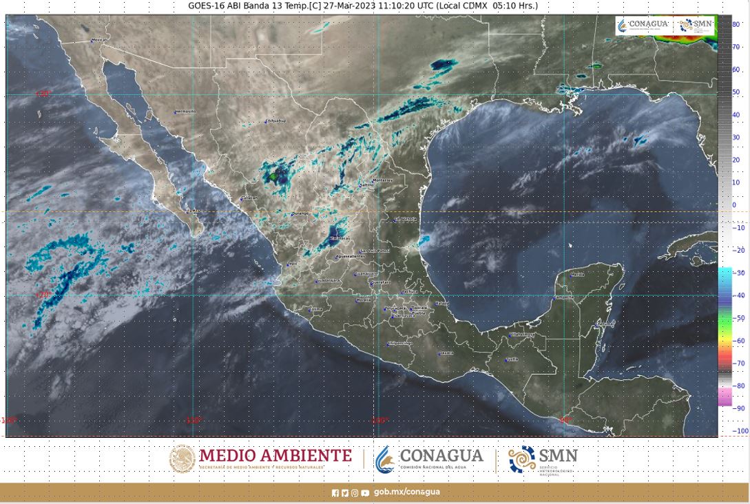 Finalmente, una circulación anticiclónica en niveles medios de la atmósfera, mantendrá el ambiente caluroso a muy caluroso en gran parte de la República Mexicana, con temperaturas máximas superiores a 40 °C en Nuevo León, Tamaulipas, San Luis Potosí, Nayarit, Jalisco, Colima, Michoacán, Guerrero, Morelos, Veracruz, Oaxaca, Campeche y Yucatán.