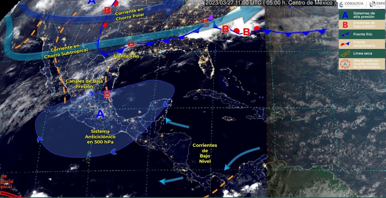 Pronóstico del clima para hoy lunes 27 de marzo 2023 en Quintana Roo. Para este día, un nuevo frente frío sobre el noreste del país, interaccionará con una línea seca que se establecerá por la tarde al norte de Coahuila y con la corriente en chorro subtropical, originando lluvias puntuales fuertes en Coahuila, así como chubascos en Nuevo León y Tamaulipas; todas con descargas eléctricas y posible caída de granizo.