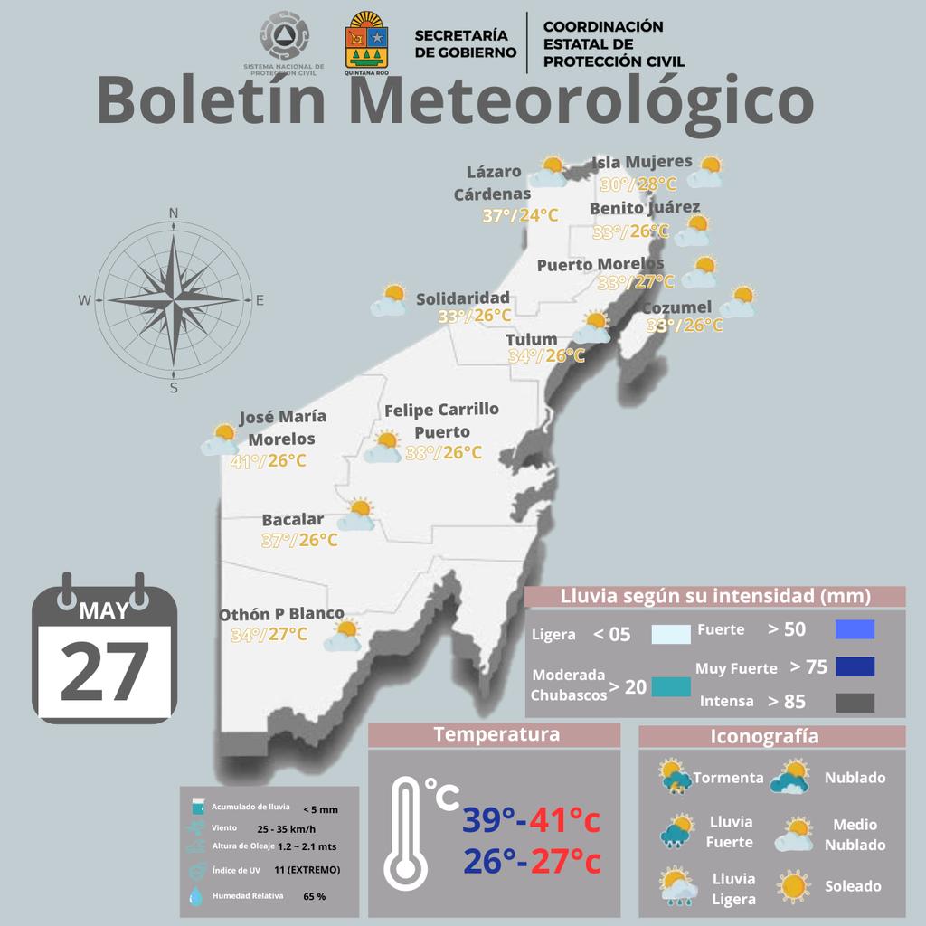 Pronóstico del clima para hoy lunes 27 de mayo 2024 en Quintana Roo.- Este día, una circulación anticiclónica en niveles medios de la atmósfera mantendrá la tercera onda de calor de la temporada sobre México, pronosticándose temperaturas máximas superiores a 45° C en Sonora, Chihuahua, Sinaloa, Nayarit, Jalisco, Michoacán, Guerrero, Oaxaca, Chiapas, Coahuila, Nuevo León, Tamaulipas, San Luis Potosí, Hidalgo (norte), Morelos, Veracruz, Tabasco, Campeche y Yucatán.