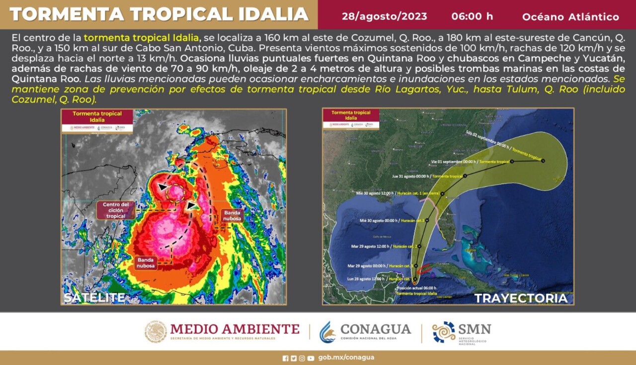 Pronóstico del clima para hoy lunes 28 de agosto 2023 en Quintana Roo. Para hoy, el centro del ciclón tropical “Idalia” se localizará frente a las costas de Quintana Roo; sus bandas nubosas generan lluvias puntuales intensas en zonas de Quintana Roo, lluvias muy fuertes en Yucatán y lluvias fuertes en Campeche, así como fuertes rachas de viento y oleaje elevado en las costas de Quintana Roo y Yucatán.
