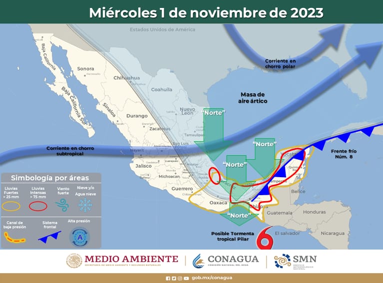 Asimismo, sobre el sureste mexicano interaccionará con la extensa circulación de la tormenta tropical “Pilar” y propiciará lluvias puntuales torrenciales en Chiapas, así como puntuales intensas en Oaxaca.