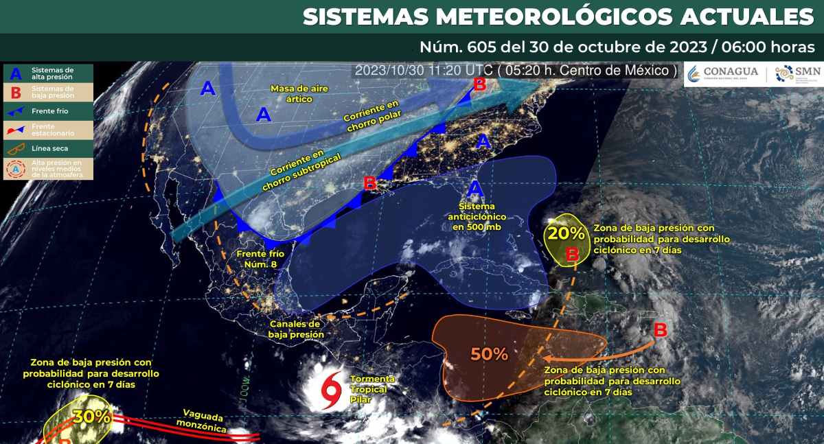 Asimismo, sobre el sureste mexicano interaccionará con la extensa circulación de la tormenta tropical “Pilar” y propiciará lluvias puntuales torrenciales en Chiapas, así como puntuales intensas en Oaxaca.