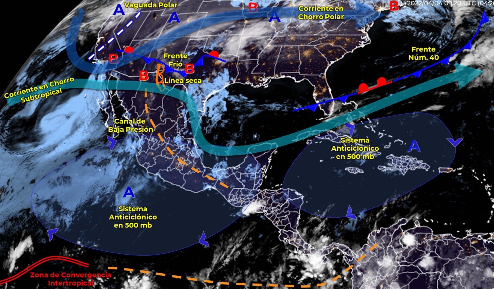 Por otro lado, un nuevo sistema frontal que se aproximará a la frontera norte de México, interaccionará con una línea seca sobre el norte de Coahuila y un canal de baja presión en el interior de la República Mexicana y originarán chubascos con descargas eléctricas en Coahuila, Nuevo León y Tamaulipas. Finalmente, el ingreso de humedad del Océano Pacífico, Golfo de México y Mar Caribe, propiciará lluvias y chubascos aislados en el sureste del país.
