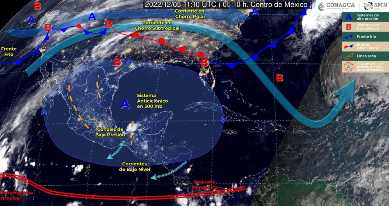 Pronóstico del clima para hoy lunes 5 de diciembre en Quintana Roo. Para hoy, la entrada de humedad generada por la corriente en chorro subtropical, ocasionará lluvias puntuales fuertes en Sonora y Chihuahua, además de chubascos en la Península de Baja California. La aproximación de un sistema frontal al noroeste del país, en interacción con una línea seca que se establecerá al norte de Coahuila, ocasionará fuertes rachas de viento en el noroeste y norte de México. Por su parte, un canal de baja presión sobre el sureste mexicano, generará lluvias y chubascos acompañados de descargas eléctricas en Veracruz, Oaxaca y Chiapas. Finalmente, una circulación anticiclónica en niveles medios de la atmósfera propiciará ambiente cálido en gran parte del territorio nacional.