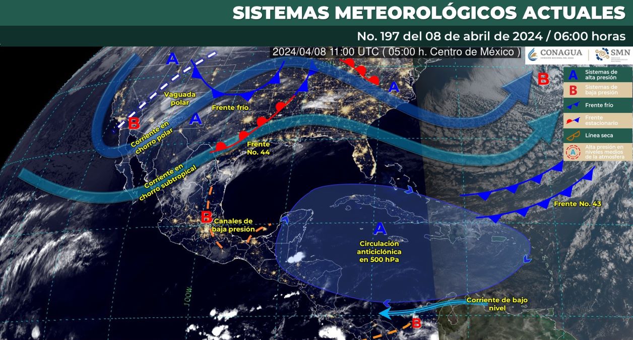 Pronóstico del clima para hoy lunes 8 abril de 2024 en Quintana Roo. Este día, un frente frío se aproximará al noroeste y norte de México, interaccionará con una línea seca que se establecerá sobre Coahuila, con una vaguada polar que recorrerá el norte de Sonora y Chihuahua, y con la corriente en chorro polar, generando intervalos de chubascos con descargas eléctricas y caída de granizo en Coahuila, Nuevo León y Tamaulipas, con probable formación de torbellinos o tornados en dichas entidades.