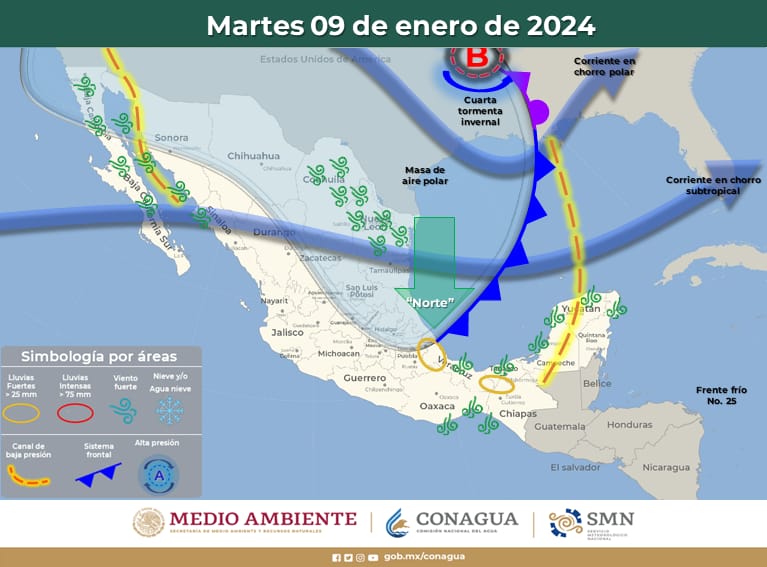 Hoy lunes, el frente frío No. 25, en combinación con la cuarta tormenta invernal y las corrientes en chorro polar y subtropical, ocasionarán condiciones favorables para la caída de nieve o aguanieve en Sonora, Chihuahua, Sinaloa y Durango, así como vientos fuertes en el noroeste, norte, noreste y centro del país.
